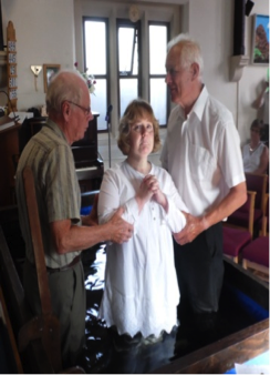 Cheryl is pictured being baptised by Pastor John Tunnicliffe and Alan Baseley in front of family and friends.